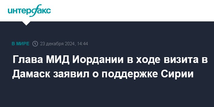 Москва. 23 декабря. INTERFAX.RU - Глава МИД Иордани Айман Сафади в понедельник во время визита в Дамаск заявил о поддержке процесса восстановления Сирии и выразил надежду на политические преобразования в стране, сообщает телеканал LBCI.