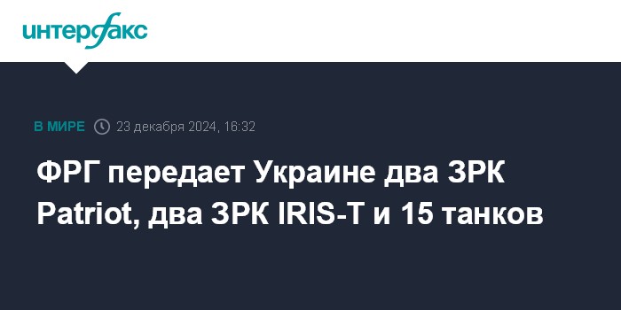 Москва. 23 декабря. INTERFAX.RU - Власти Германии выделяют Киеву очередной пакет военной помощи, куда вошли два зенитных ракетных комплекса (ЗРК) Patriot, один ЗРК ближнего радиуса действия IRIS-T SLS, один ЗРК среднего радиуса действия IRIS-T SLM, две зенитных самоходных установки GEPARD и 65 тыс. снарядов к ним, сообщили в Минобороны ФРГ.