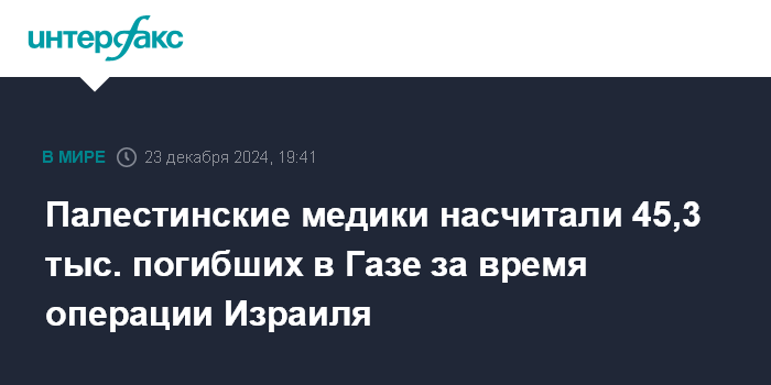Москва. 23 декабря. INTERFAX.RU - Число палестинцев, погибших в результате операций израильской армии в секторе Газа, превысило 45,3 тыс. человек, еще около 107,7 тыс. получили ранения, сообщают в понедельник ближневосточные СМИ со ссылкой на палестинские медслужбы.