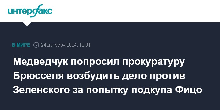 Москва. 24 декабря. INTERFAX.RU - Оппозиционный украинский политик, лидер "Другой Украины" Виктор Медведчук обратился в прокуратуру Брюсселя с просьбой возбудить уголовное дело в отношении Владимира Зеленского в связи с "попыткой подкупа премьер-министра Словакии Роберта Фицо".