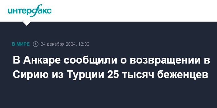Москва. 24 декабря. INTERFAX.RU - После перехода власти в Дамаске от Башара Асада к сирийской вооруженной оппозиции свыше 25 тысяч сирийских беженцев возвратились из Турции в Сирию, заявил глава турецкого МВД Али Ерликая. Его цитируют западные СМИ.