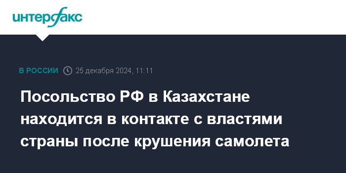 Москва. 25 декабря. INTERFAX.RU - Посольство РФ в Казахстане находится в контакте с властями страны по вопросу оказания содействия пострадавшим в крушении самолета Баку-Грозный, сообщила официальный представитель МИД РФ Мария Захарова.