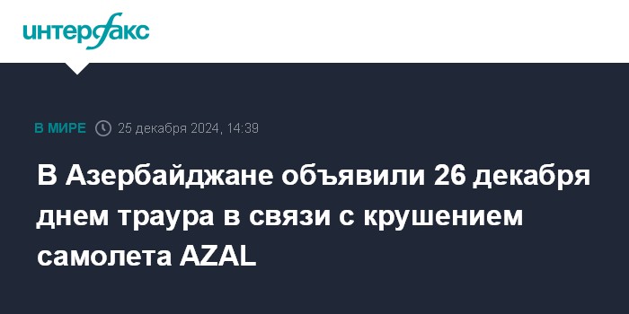 Москва. 25 декабря. INTERFAX.RU - В Азербайджане 26 декабря объявлено днем траура в связи с гибелью людей при крушении самолета авиакомпании AZAL недалеко от казахстанского города Актау.