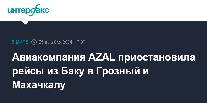Москва. 25 декабря. INTERFAX.RU - Авиакомпания "Азербайджанские авиалинии" (AZAL) сообщила, что приостановила выполнение рейсов по маршруту Баку-Грозный-Баку и Баку-Махачкала-Баку до завершения расследования причин крушения самолета авиакомпании недалеко от казахстанского Актау.