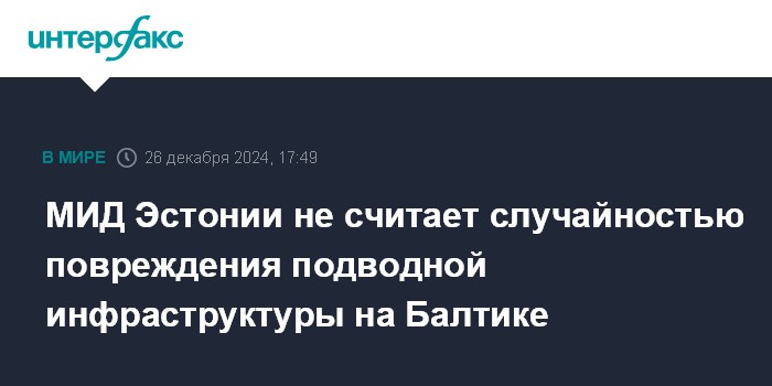Москва. 26 декабря. INTERFAX.RU - Глава МИД Эстонии Маргус Цахкна не считает произошедшие в последнее время в Балтийском море повреждения подводной инфраструктуры случайностью и заявляет, что инциденты следует рассматривать как нападения на жизненно важные структуры государств.