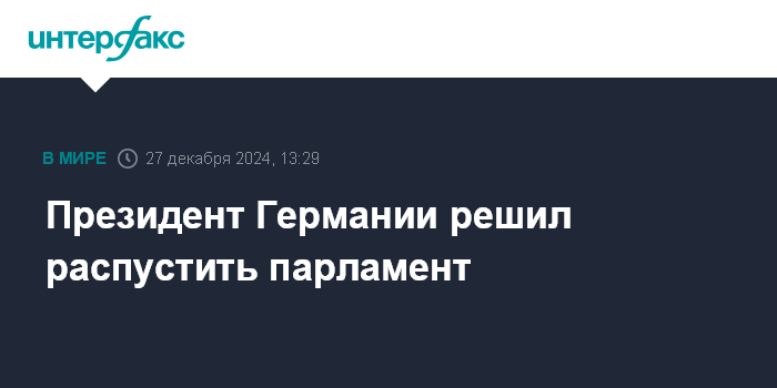 Москва. 27 декабря. INTERFAX.RU - Президент ФРГ Франк-Вальтер Штайнмайер в пятницу принял решение распустить парламент Германии (Бундестаг), тем самым открыв путь к досрочным парламентским выборам, сообщает радиостанция Deutschlandfunk.
