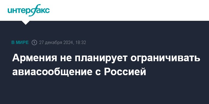 Москва. 27 декабря. INTERFAX.RU - Власти Армении не планируют отменять выполнение авиакомпаниями гражданских рейсов в Россию после катастрофы самолета авиакомпании Azerbaijan Arilines.