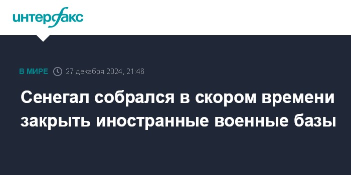 Москва. 27 декабря. INTERFAX.RU - Власти Сенегала объявили в пятницу о решении закрыть все военные базы иностранных сил на территории страны. Об этом сообщает Associated Press со ссылкой на премьера Усмана Сонко.