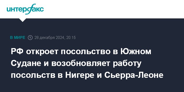 РФ откроет посольство в Южном Судане и возобновляет работу посольств в Нигере и Сьерра-Леоне