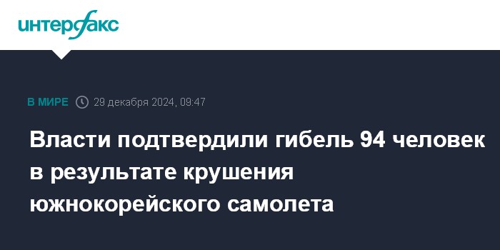 Москва. 29 декабря. INTERFAX.RU - Официально подтверждена гибель 94 человек при крушении пассажирского самолета южнокорейской авиакомпании Jeju Air, выжили два человека - пассажир и член экипажа, сообщает агентство "Ренхап" со ссылкой на власти.