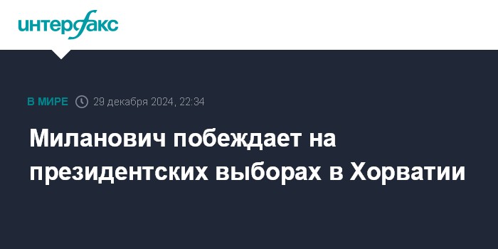 Москва. 29 декабря. INTERFAX.RU - Действующий президент Хорватии Зоран Миланович получает 51,5% голосов в первом туре выборов главы государства, таким образом, он близок к тому, чтобы сохранить за собой президентский пост, сообщают в воскресенье западные СМИ со ссылкой на результаты экзит-поллов.
