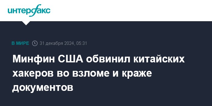 Москва. 31 декабря. INTERFAX.RU - Китайские хакеры удаленно получили доступ к нескольким электронным системам Министерства финансов США и несекретным документам, сообщают американские СМИ со ссылкой на письмо ведомства законодателям.