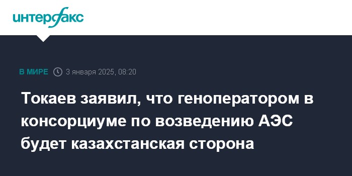 Москва. 3 января. INTERFAX.RU - В консорциуме по строительству АЭС генеральным оператором выступит казахстанская сторона, сообщил президент Казахстана Касым-Жомарт Токаев.
