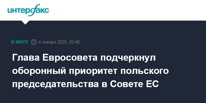 Москва. 4 января. INTERFAX.RU - Председатель Европейского совета Антониу Кошта заявил, что Польша находится "на переднем крае оборонных возможностей" Евросоюза, которые необходимо развивать для защиты стран, обществ и ценностей ЕС.