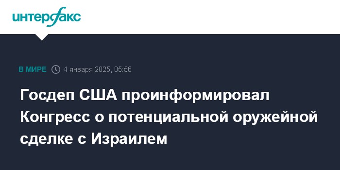 "Госдепартамент неофициально уведомил Конгресс о предлагаемой сделке с Израилем на поставки оружия на сумму $8 млрд", - говорится в сообщении.