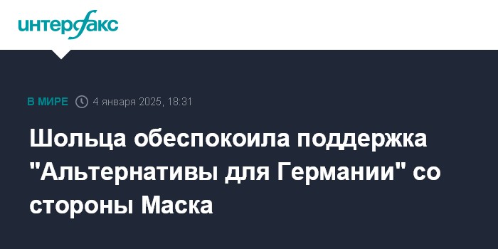 Москва. 4 января. INTERFAX.RU - Поддержка, которую бизнесмен Илон Маск выражает ультраправой партии "Альтернатива для Германии", вызывает тревогу, заявил в субботу канцлер ФРГ Олаф Шольц.
