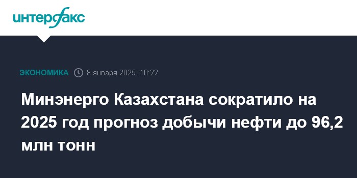 Москва. 8 января. INTERFAX.RU - Казахстан пересмотрел прогноз добычи нефти на 2025 год с ранее планируемых 97,2 млн тонн до 96,2 млн тонн, сообщили агентству "Интерфакс-Казахстан" в Минэнерго республики.