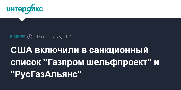 Москва. 10 января. INTERFAX.RU - США включили в санкционный список АО "Газпром шельфпроект", оказывающее услуги при реализации морских нефтегазовых проектов.