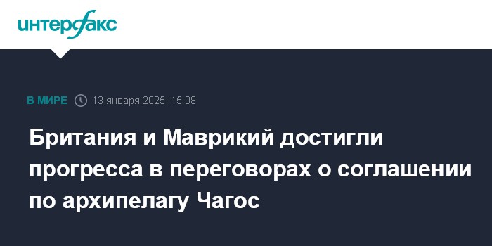 Москва. 13 января. INTERFAX.RU - Представители Великобритании и Маврикия провели переговоры о будущем архипелага Чагос, по итогам которых сторонам удалось добиться значительного прогресса, сообщили в понедельник в британском МИД.