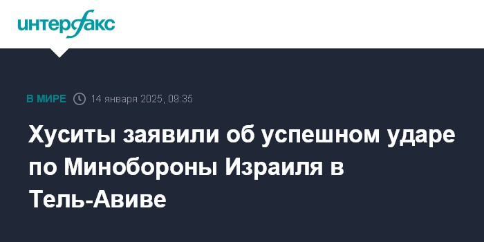 Москва. 14 января. INTERFAX.RU - Йеменские мятежники-хуситы во вторник заявили, что атаковали здание израильского министерства обороны, расположенное в Тель-Авиве.