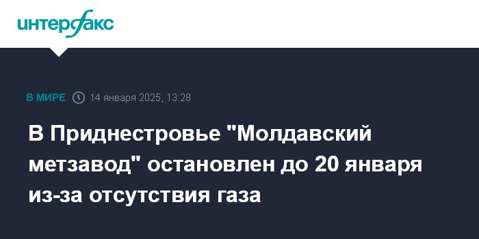 Москва. 14 января. INTERFAX.RU - Крупнейшее предприятие Приднестровья - ОАО "Молдавский металлургический завод" (ММЗ, Рыбницы) - приостановило работу до 20 января из-за прекращения поставки в регион российского газа, сообщил ММЗ.