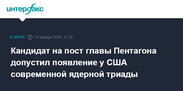 Москва. 14 января. INTERFAX.RU - США следует вести с другими странами переговоры по контролю над вооружениями, а если это окажется невозможным - работать над модернизацией ядерного арсенала, над созданием современной ядерной триады, заявил кандидат на пост главы Пентагона Пит Хегсет.