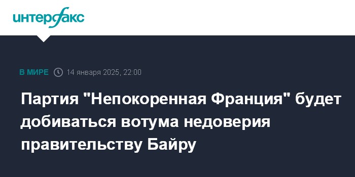 Москва. 14 января. INTERFAX.RU - Партия левого толка "Непокоренная Франция" объявила во вторник в Национальном собрании о планах добиваться вотума недоверия французскому премьер-министру Франсуа Байру.