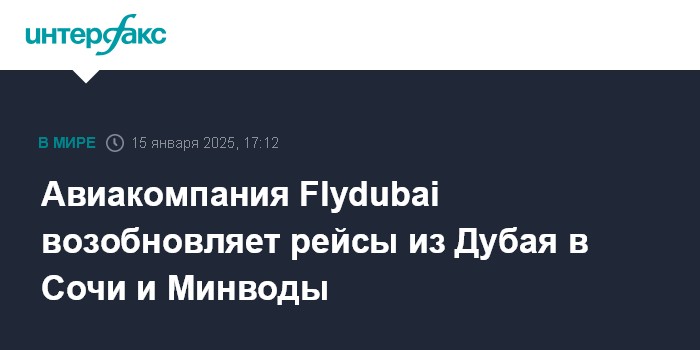 "Flydubai возобновляет в полном объеме рейсы в Минеральные воды и Сочи с 23.01 и 25.01 соответственно - официальное сообщение от перевозчика получено. Полеты будут осуществляться в соответствии с прежним расписанием", - написал он в своем телеграм-канале.