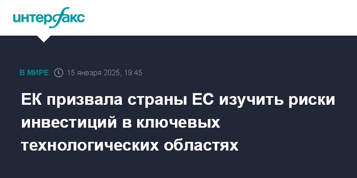 Москва. 15 января. INTERFAX.RU - Еврокомиссия (ЕК) опубликовала в среду рекомендации, призывающие государства-члены ЕС проанализировать инвестиции своих компаний в ключевых технологических областях в странах, не входящих в Евросоюз.