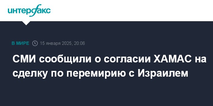 Москва. 15 января. INTERFAX.RU - Делегация ХАМАС передала посредникам свое согласие на сделку по перемирию с Израилем и освобождению заложников, сообщает в среду Al Jazeera.