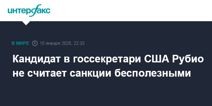 Москва. 15 января. INTERFAX.RU - Введение Соединенными Штатами санкций против других стран может быть полезным, несмотря на то, что такая практика не всегда приводит к изменению в политике лидеров этих государств, заявил в среду кандидат на пост госсекретаря Марко Рубио.