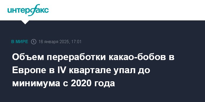Объем переработки какао-бобов в Европе в IV квартале упал до минимума с 2020 года