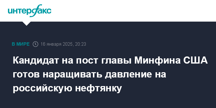 Москва. 16 января. INTERFAX.RU - Кандидат на пост главы Минфина США Скотт Бессент на слушаниях в Сенате заявил, что в случае утверждения будет готов, если это потребуется, к введению дополнительных санкций против России, в частности ее нефтяных компаний, чтобы повлиять на позицию Москвы по Украине.