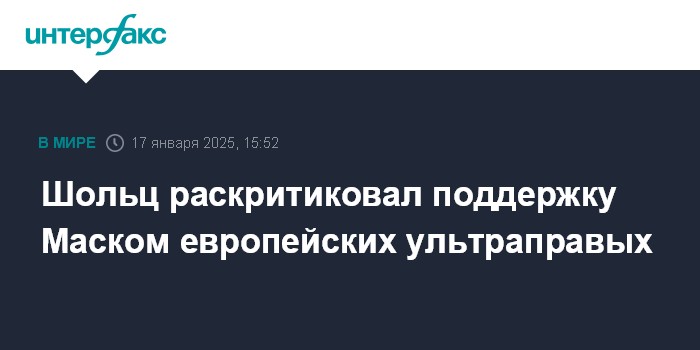 Москва. 17 января. INTERFAX.RU - Канцлер Германии Олаф Шольц на пресс-конференции назвал недопустимой поддержку американским миллиардером Илоном Маском европейских ультраправых партий, сообщает AP.