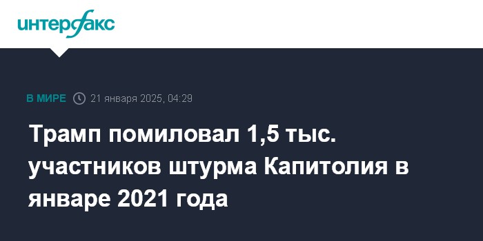 Москва. 21 января. INTERFAX.RU - Президент США Дональд Трамп подписал указ о помиловании участников штурма Капитолия 6 января 2021 года, передает телеканал CNN.