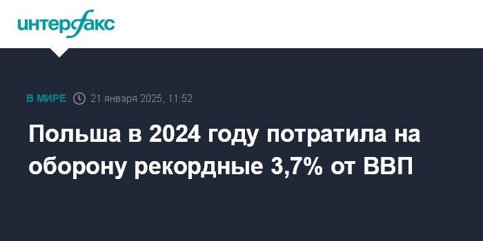 Москва. 21 января. INTERFAX.RU - В 2024 году Польша потратила на оборону 3,7% ВВП, что стало рекордным показателем, пишет Rzeczpospolita.