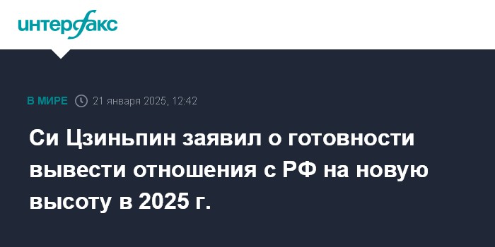 Москва. 21 января. INTERFAX.RU - Китай намерен вывести свои отношения с РФ на новый уровень в 2025 году, заявил председатель КНР Си Цзиньпин.