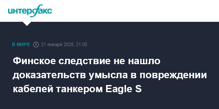 Москва. 21 января. INTERFAX.RU - Национальное бюро расследований (НБР) Финляндии не нашло доказательств умышленного повреждения подводных кабелей танкером Eagle S, сообщает газета Helsingin Sanomat во вторник.
