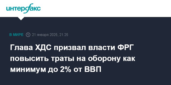 Москва. 21 января. INTERFAX.RU - Властям ФРГ нужно первым делом достичь показателя в 2% от ВВП на оборону, требуемого НАТО, прежде чем начинать разговоры об еще более значимом наращивании военных расходов, заявил лидер консервативной партии ХДС Фридрих Мерц.