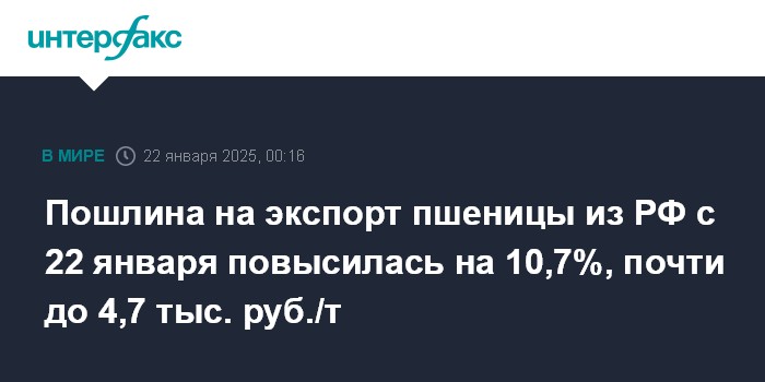 Москва. 22 января. INTERFAX.RU - Ставка пошлины на экспорт пшеницы из РФ с 22 января повысилась на 10,7%, до 4 699,6 рубля с 4 245 рублей за тонну, сообщает Минсельхоз.