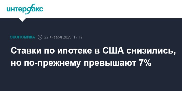 Москва. 22 января. INTERFAX.RU - В США на прошлой неделе средний размер ставок по долгосрочным ипотечным кредитам понизился на 7 базисных пунктов на прошлой неделе, однако остается у максимальных значений с лета 2024 года, сообщила Ассоциация ипотечных банкиров (MBA).