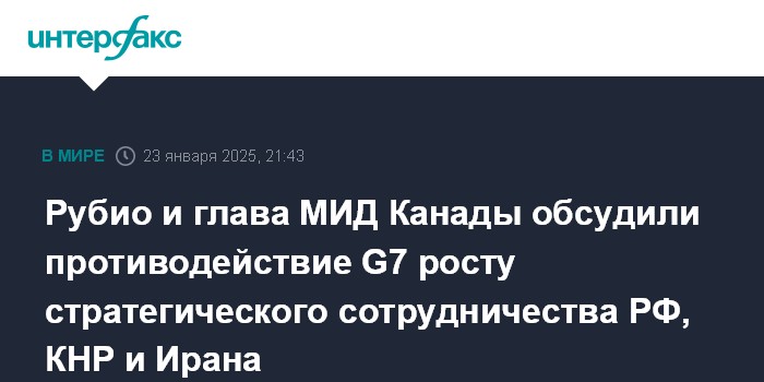 Москва. 23 января. INTERFAX.RU - Одной из тем телефонного разговора госсекретаря США Марко Рубио и главы МИД Канады Мелани Жоли стали меры G7 против наращивания стратегического взаимодействия между РФ, КНР и Ираном, говорится в пресс-релизе канадского правительства.