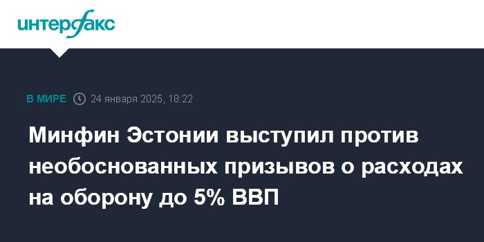 Москва. 24 января. INTERFAX.RU - Министр финансов Эстонии Юрген Лиги призвал избегать необоснованных заявлений о возможности увеличения оборонных расходов в странах НАТО до 5% валового внутреннего продукта.