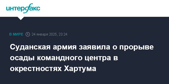 Москва. 24 января. INTERFAX.RU - Вооруженные силы Судана в пятницу объявили, что им удалость прорвать осаду Сил быстрого реагирования (СБР) вокруг командного центра войск связи в городе Северный Хартум, сообщают западные СМИ.