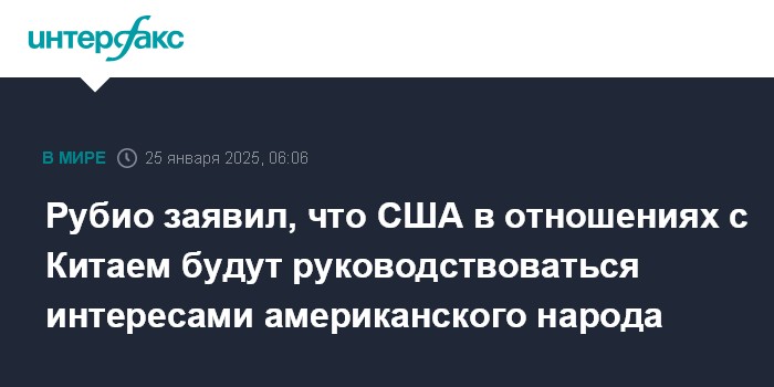 Москва. 25 января. INTERFAX.RU - Приоритетом Соединенных Штатов в отношениях с Китаем будет соблюдение интересов американского народа, заявил в телефонной беседе с министром иностранных дел КНР Ван И госсекретарь США Марко Рубио.