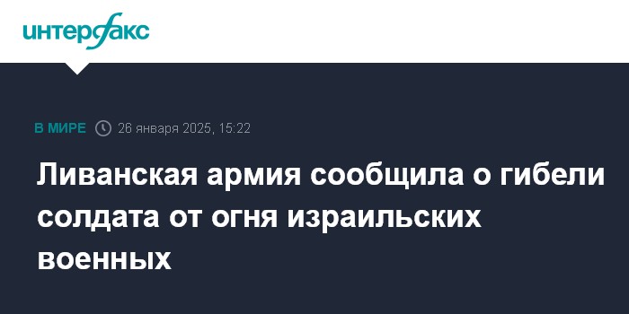 Москва. 26 января. INTERFAX.RU - Вооруженные силы Ливана в воскресенье сообщили, что потеряли убитым одного военнослужащего на юге страны из-за огня израильских военных, сообщает LBCI.