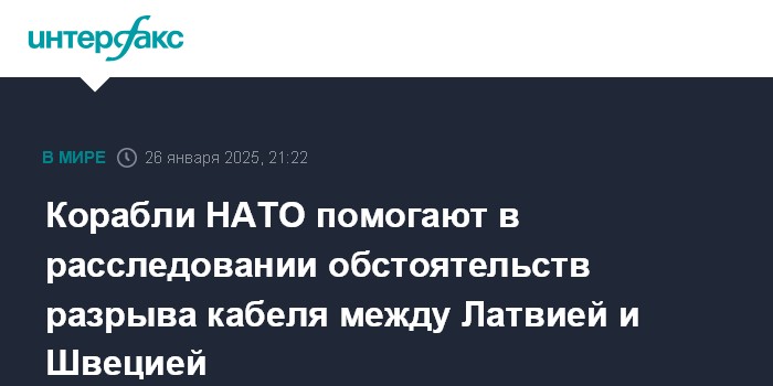 Москва. 26 января. INTERFAX.RU - Военный альянс НАТО участвует в расследовании разрыва кабеля между Латвией и Швецией, сообщил в воскресенье портал телерадиовещания Yle со ссылкой на военно-морской штаб НАТО.