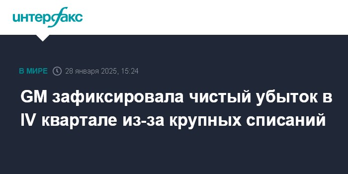Москва. 28 января. INTERFAX.RU - Американский автопроизводитель General Motors Co. (GM) зафиксировал чистый убыток в четвертом квартале 2024 года из-за крупных списаний, связанных, главным образом, с его китайскими операциями.