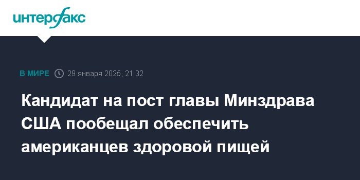 Москва. 29 января. INTERFAX.RU - Кандидат на пост министра здравоохранения США Роберт Кеннеди-младший заявил, что в случае назначения на пост планирует работать над увеличением производства здоровой пищи и над борьбой с проблемой участившихся хронических заболеваний у жителей страны.