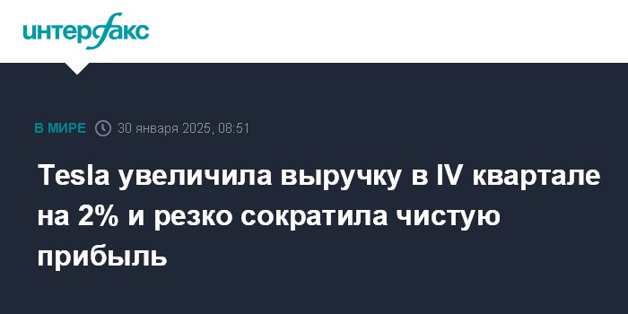 Москва. 30 января. INTERFAX.RU - Американский производитель электромобилей Tesla Inc. увеличил выручку в четвертом квартале 2024 года на 2%, однако его чистая прибыль упала в 3,4 раза.